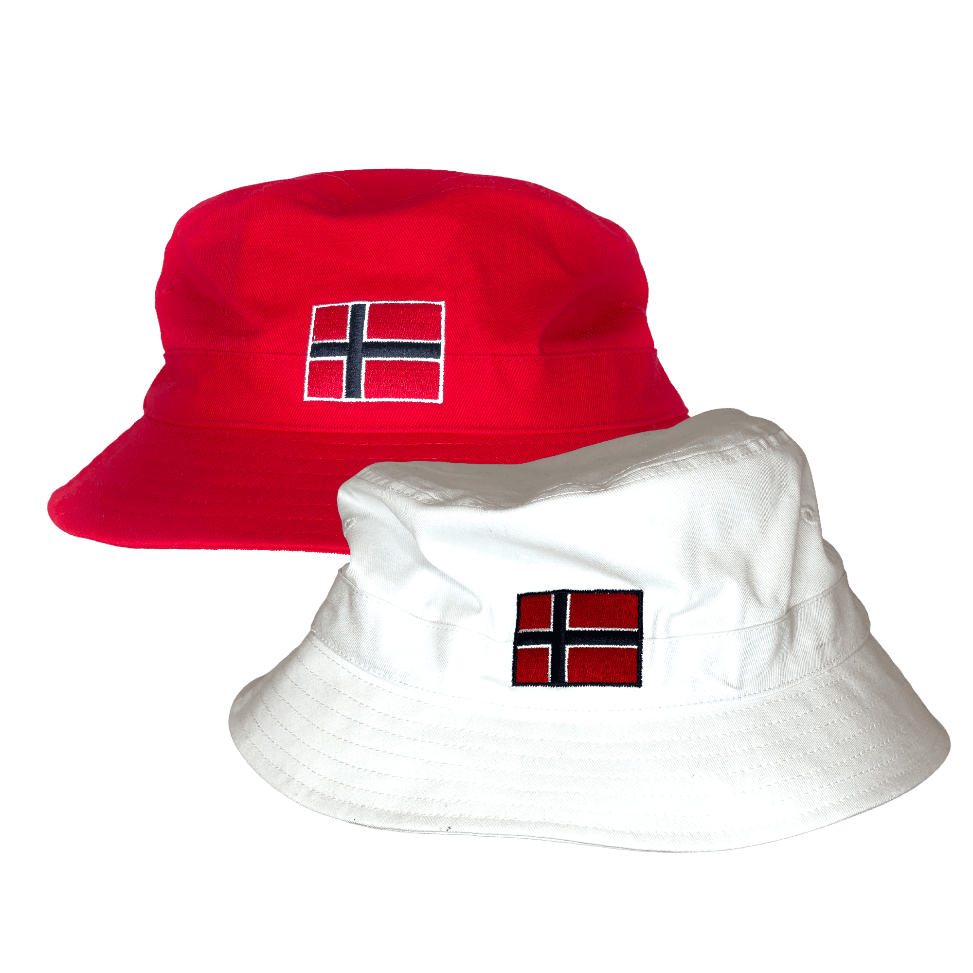 Bøttehatter med norsk brodert flagg i front